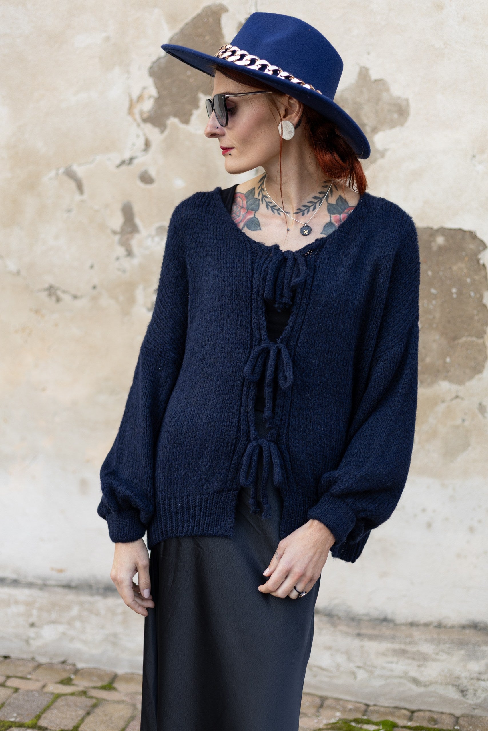 Džemperis ar bantītēm - TUMŠI ZILS. Derēs S-XL izmēram. 40% akrils, 20% viskoze, 10% vilna, 30% neilons.