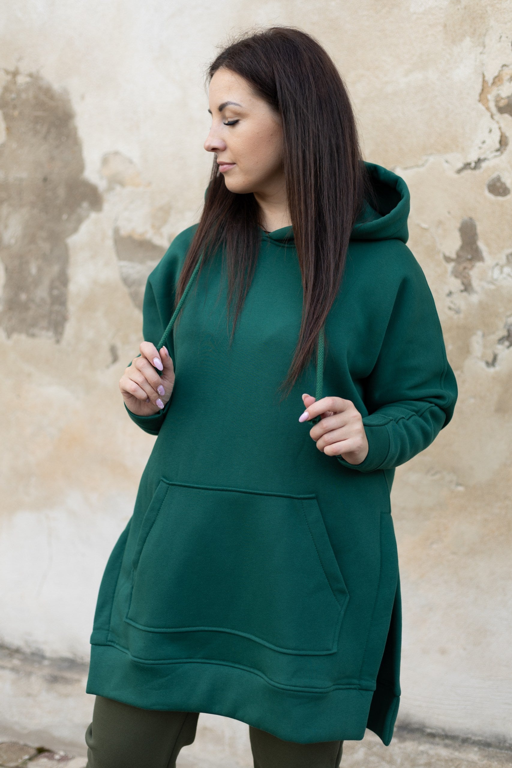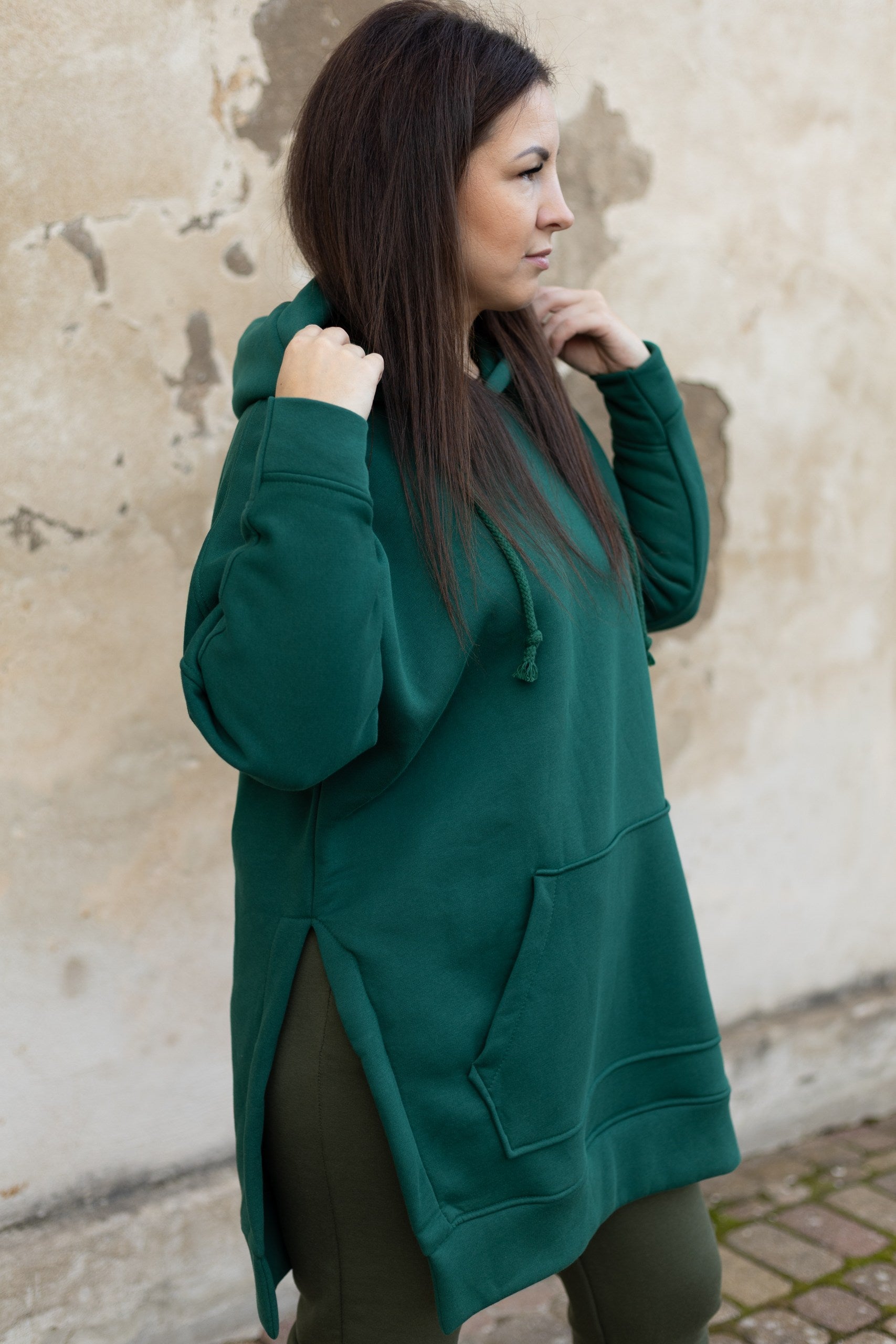 Zaļš hūdijs ar kapuci, sānos šķēlumi. Derēs M-XL izmēram, S izmēram būs diezgan oversize.