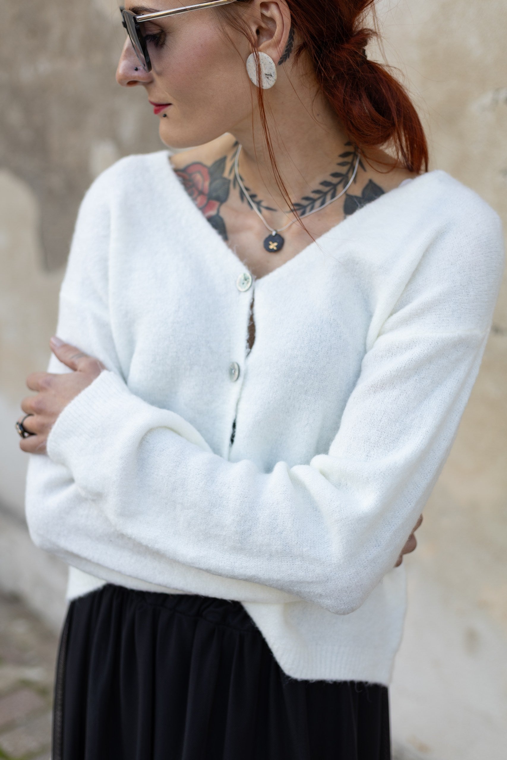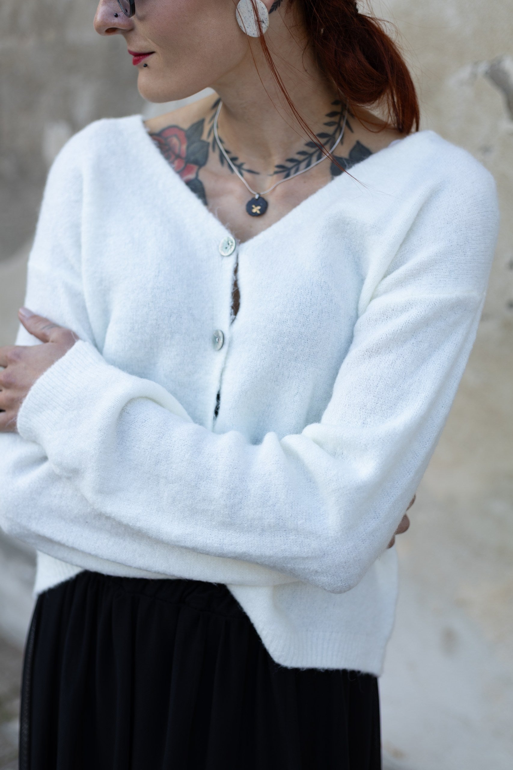 Silta jaciņa ar podziņām - BALTA. Derēs S-L izmēram. 48% akrils, 20% alpaku vilna, 22% elastāns, 10% poliesters.