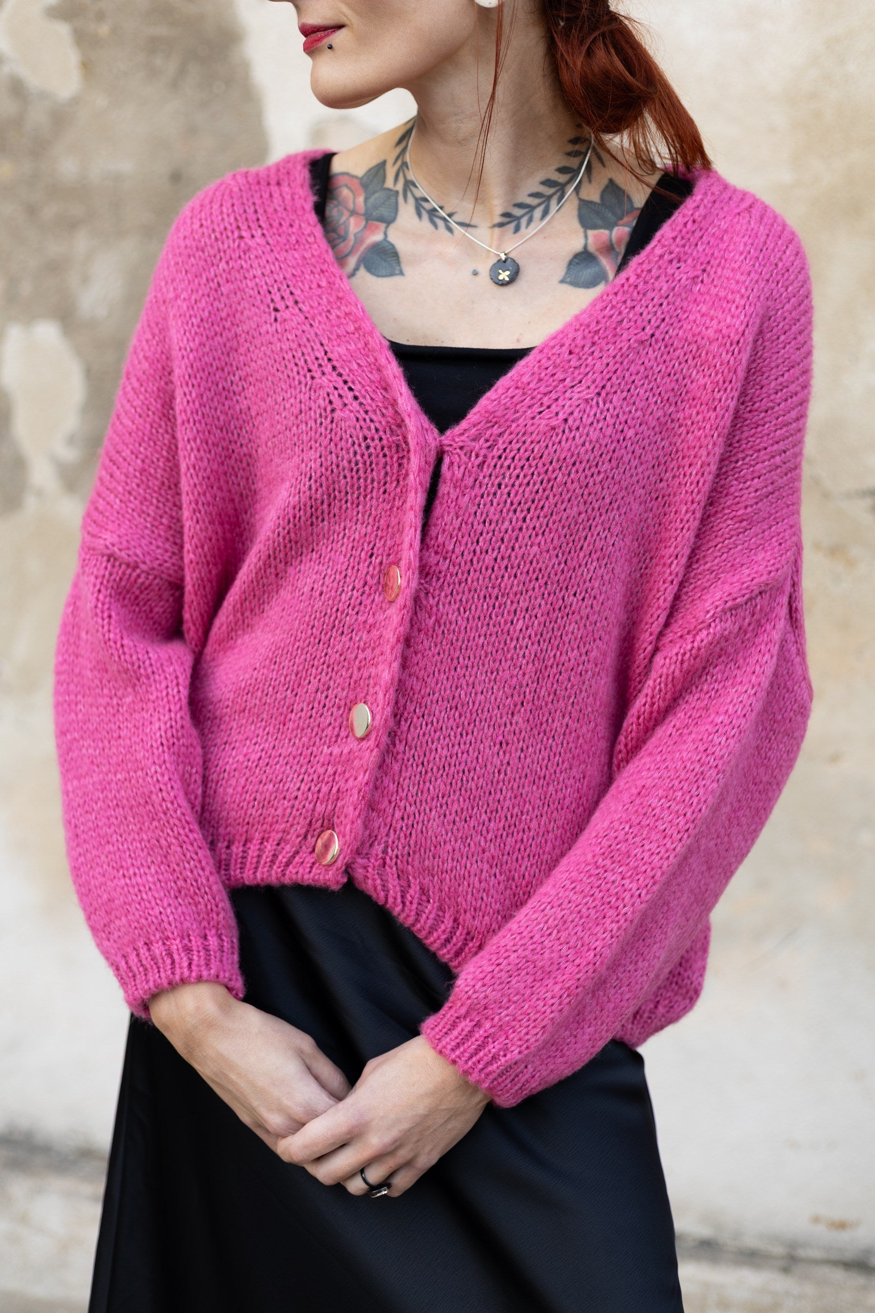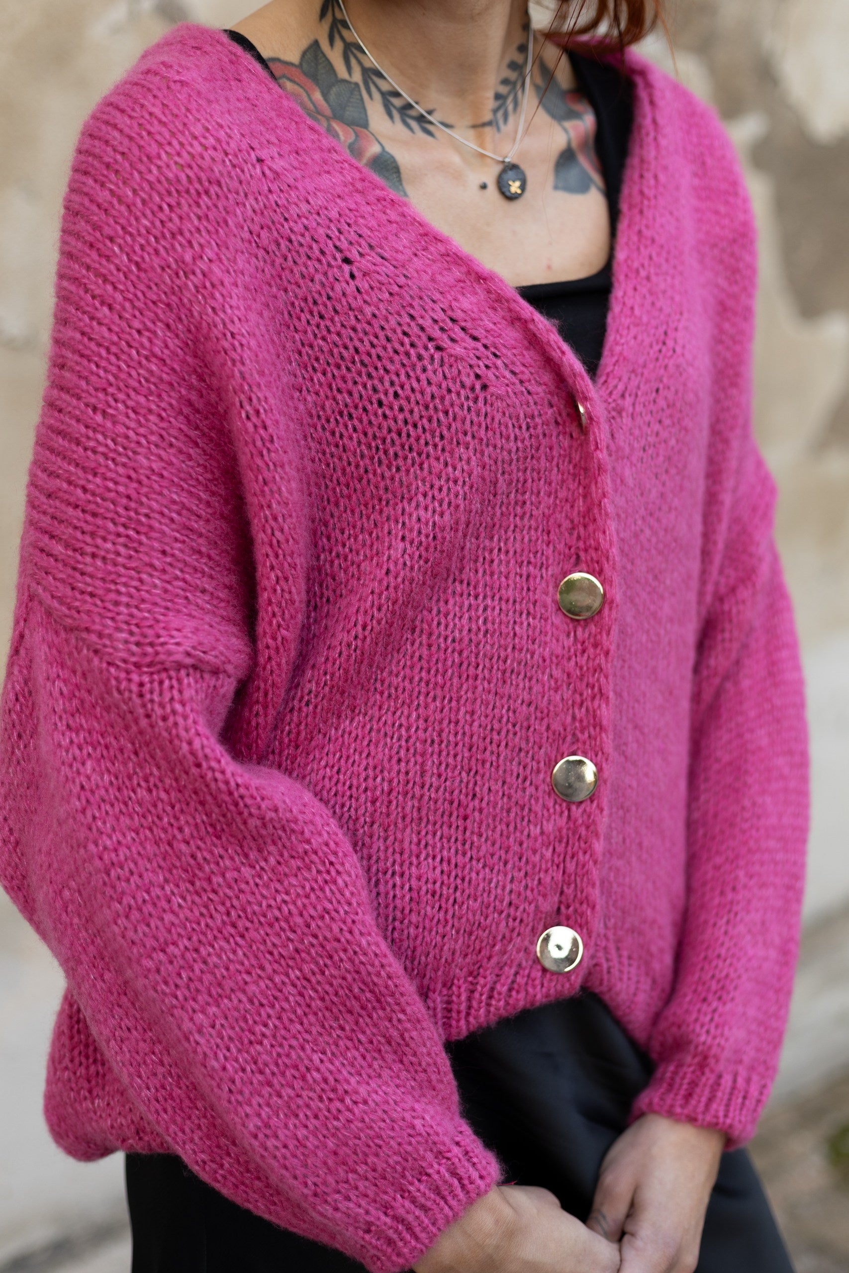 Jaka ar zelta podziņām - rozā krāsā. Derēs S-L izmēram. 70% akrils, 30% poliamīds.