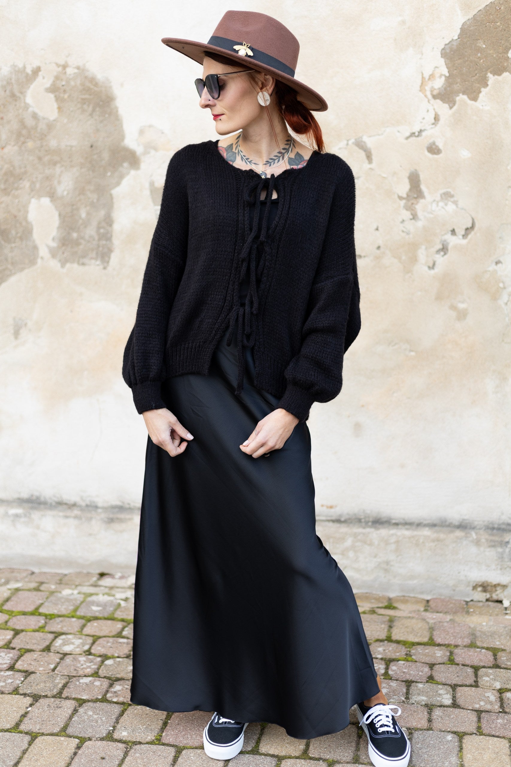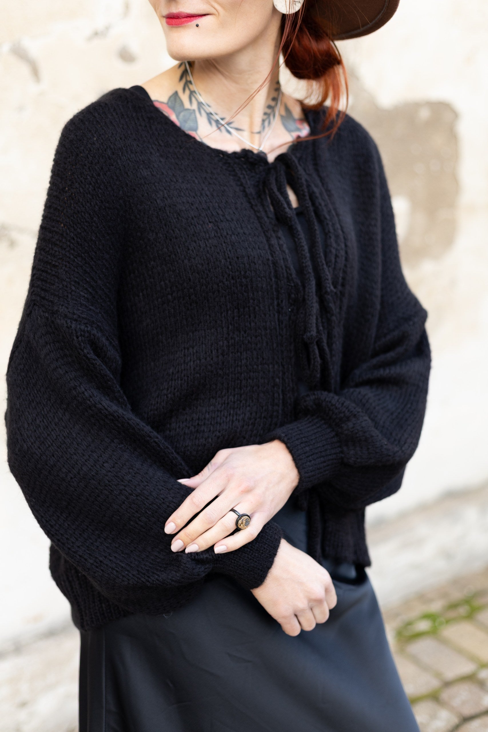 Džemperis ar bantītēm - MELNS. Derēs S-XL izmēram. 40% akrils, 20% viskoze, 10% vilna, 30% neilons.
