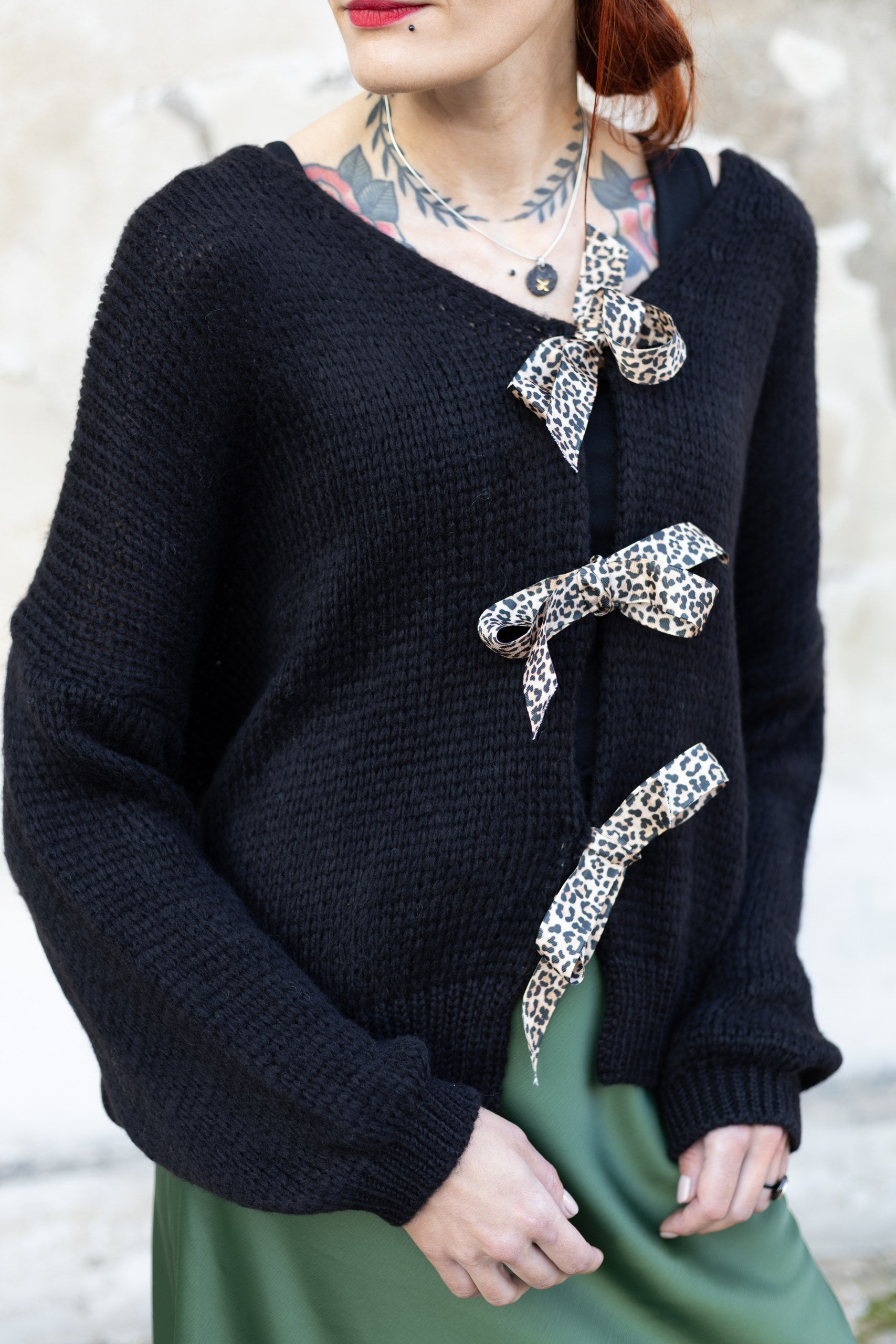 Džemperis ar leoparda bantītēm - melnā krāsā. Derēs S-XL izmēram. 40% akrils, 10% vilna, 20% viskoze, 30% neilons.