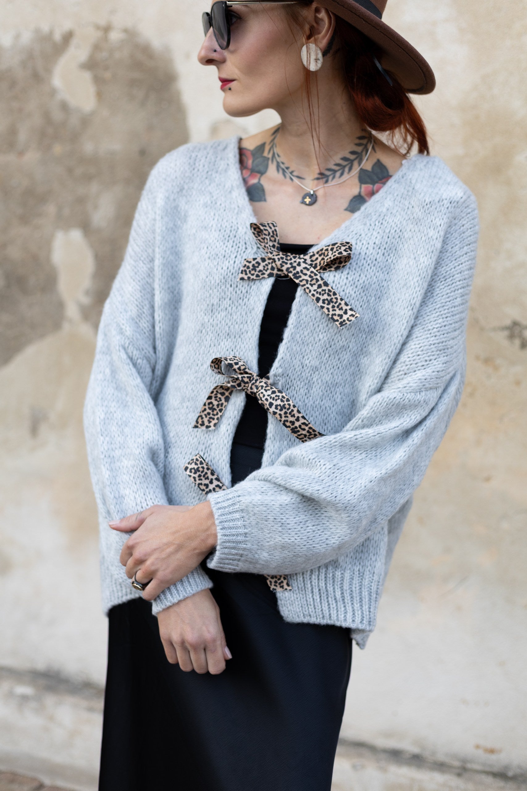 Džemperis ar leoparda bantītēm - pelēkā krāsā. Derēs S-XL izmēram. 40% akrils, 10% vilna, 20% viskoze, 30% neilons.